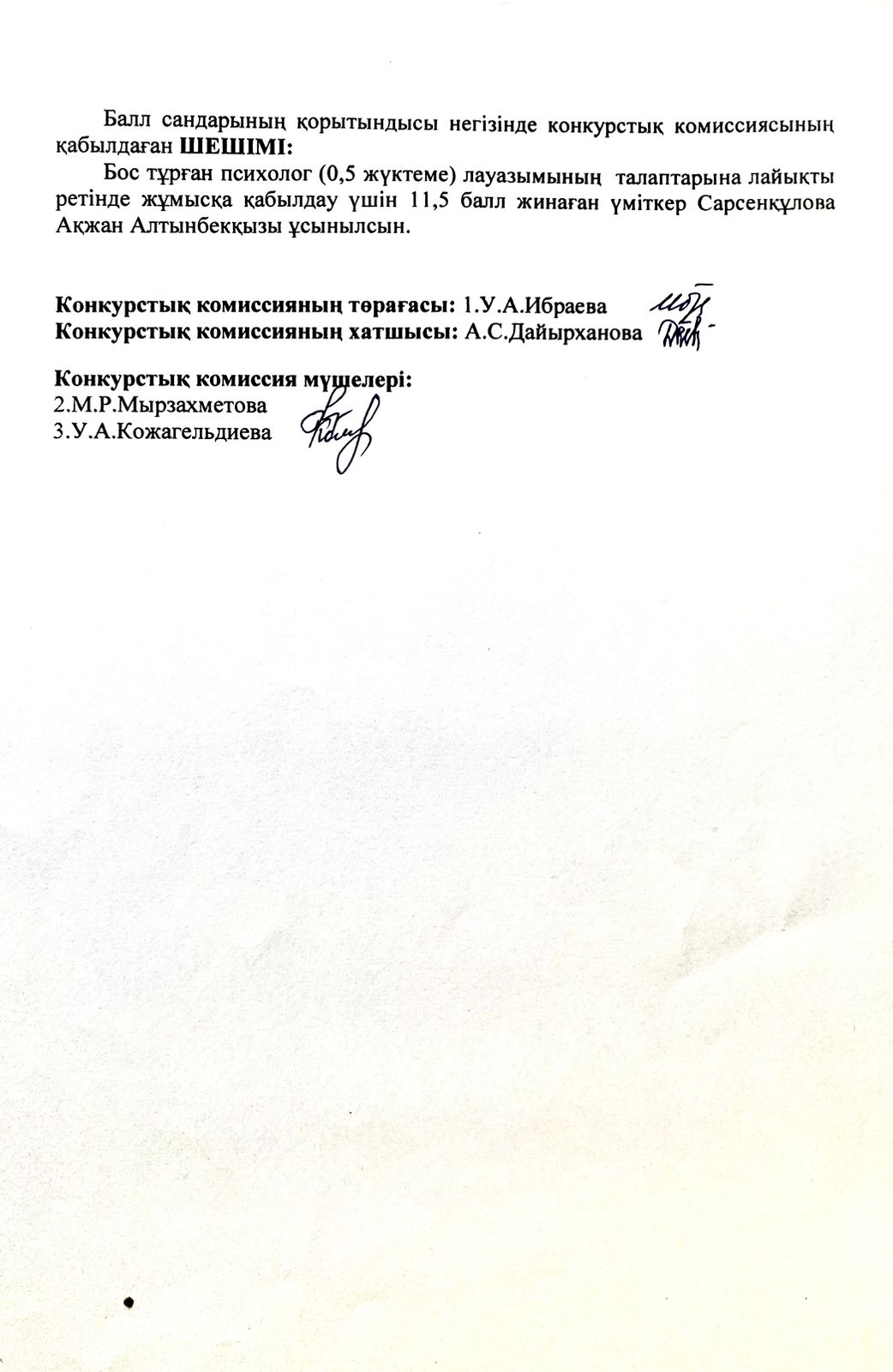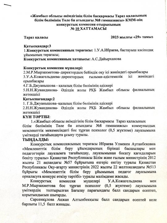 "Жамбыл облысы әкімдігінің білім басқармасы Тараз қаласының білім бөлімінің Төле би атындағы №8 гимназиясы" КММ-нің педагогтерді қабылдау конкурстық комиссия отырысының хаттамасы
