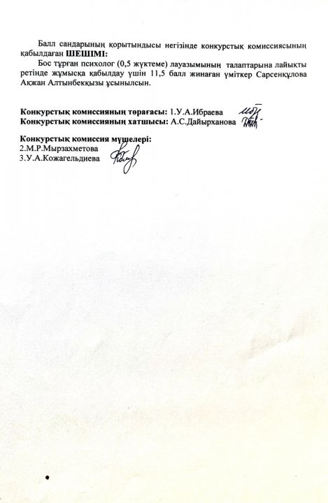 » » "Жамбыл облысы әкімдігінің білім басқармасы Тараз қаласының білім бөлімінің Төле би атындағы №8 гимназиясы" КММ-нің педагогтерді қабылдау конкурстық комиссия отырысының хаттамасы