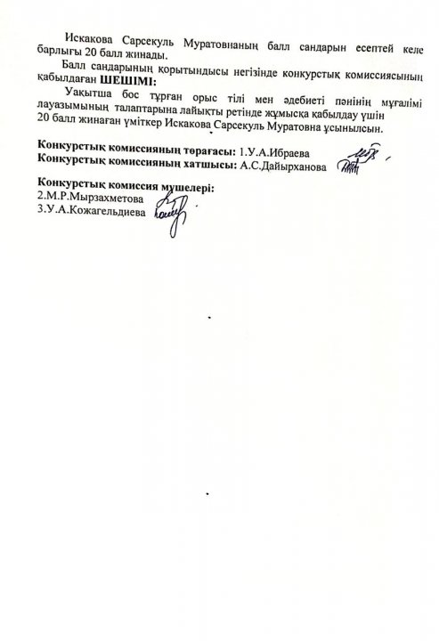 "Жамбыл облысы әкімдігінің білім басқармасы Тараз қаласының білім бөлімінің Төле би атындағы №8 гимназиясы" КММ-нің педагогтерді қабылдау конкурстық комиссия отырысының хаттамасы