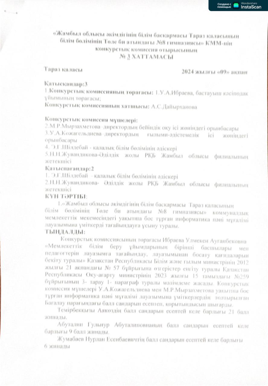 "Жамбыл облысы әкімдігінің білім басқармасы Тараз қаласының білім бөлімінің Төле би атындағы №8 гимназиясы" КММ-нің педагогтерді қабылдау конкурстық комиссия отырысының хаттамасы » Төле би атындағы №8 гимназия
