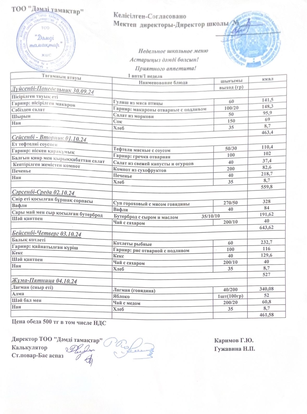 Ас мәзірі. 2024 жыл, қазан. 1-ші апта. » Төле би атындағы №8 гимназия