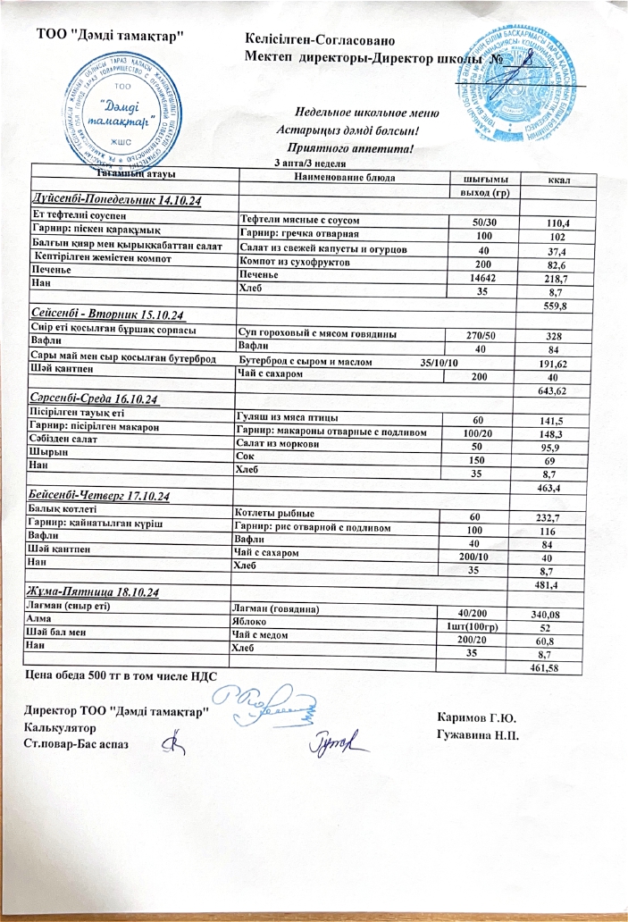 Ас мәзірі. 2024 жыл, қазан. 3-ші апта. » Төле би атындағы №8 гимназия