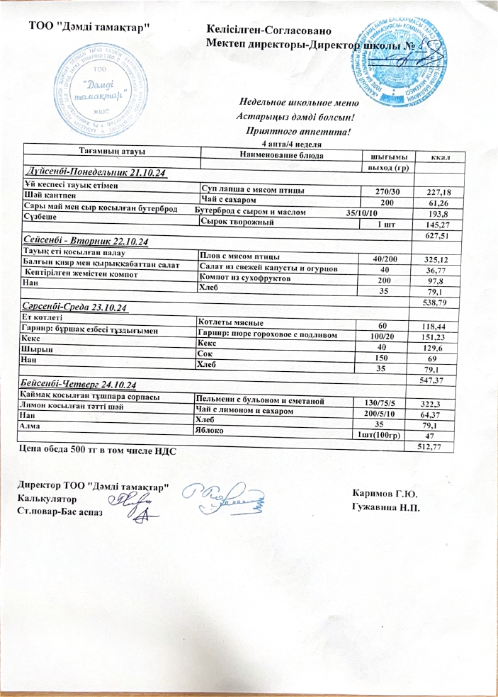 Ас мәзірі. 2024 жыл, қазан. 4-ші апта. » Төле би атындағы №8 гимназия