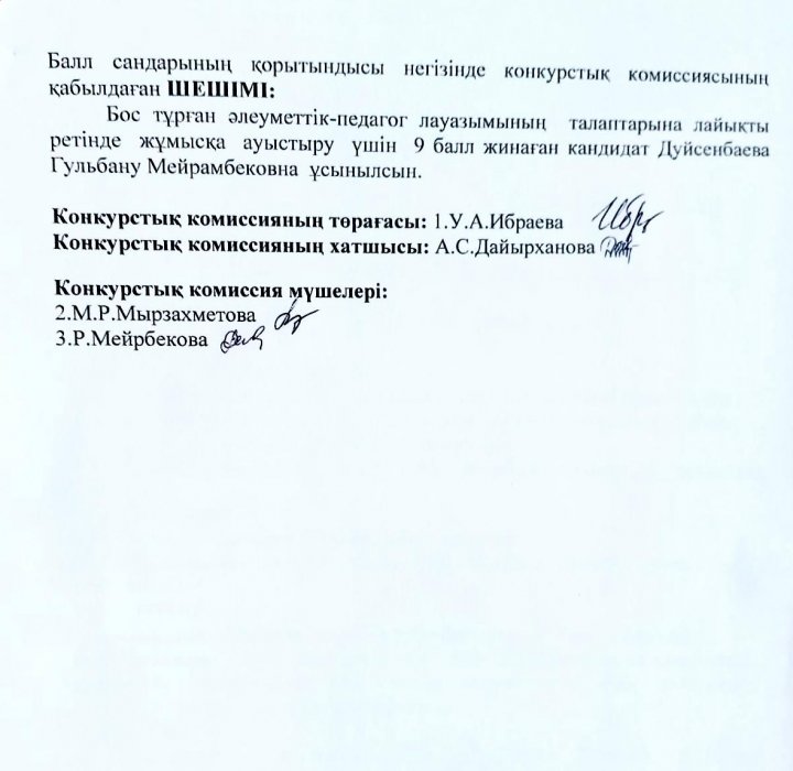 "Жамбыл облысы әкімдігінің білім басқармасы Тараз қаласының білім бөлімінің Төле би атындағы №8 гимназиясы" КММ-нің педагогтерді қабылдау конкурстық комиссия отырысының хаттамасы » Төле би атындағы №8 гимназия