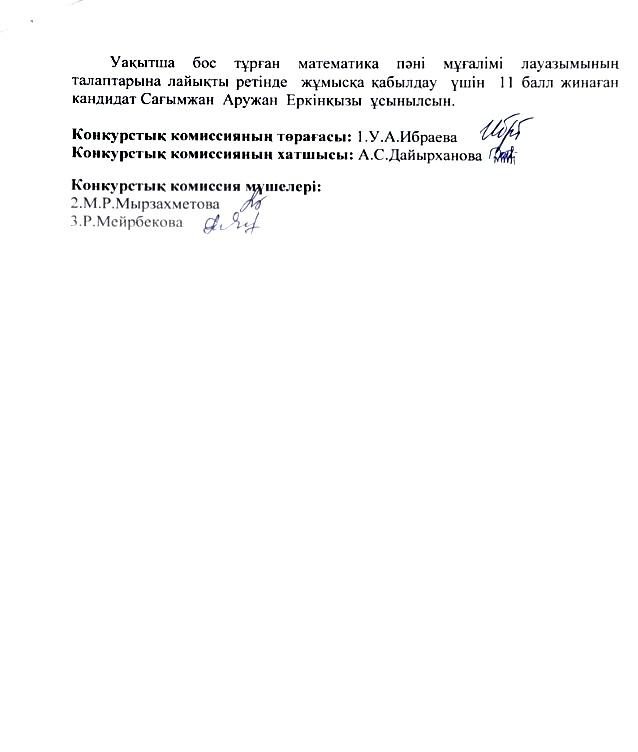 "Жамбыл облысы әкімдігінің білім басқармасы Тараз қаласының білім бөлімінің Төле би атындағы №8 гимназиясы" КММ-нің педагогтерді қабылдау конкурстық комиссия отырысының хаттамасы