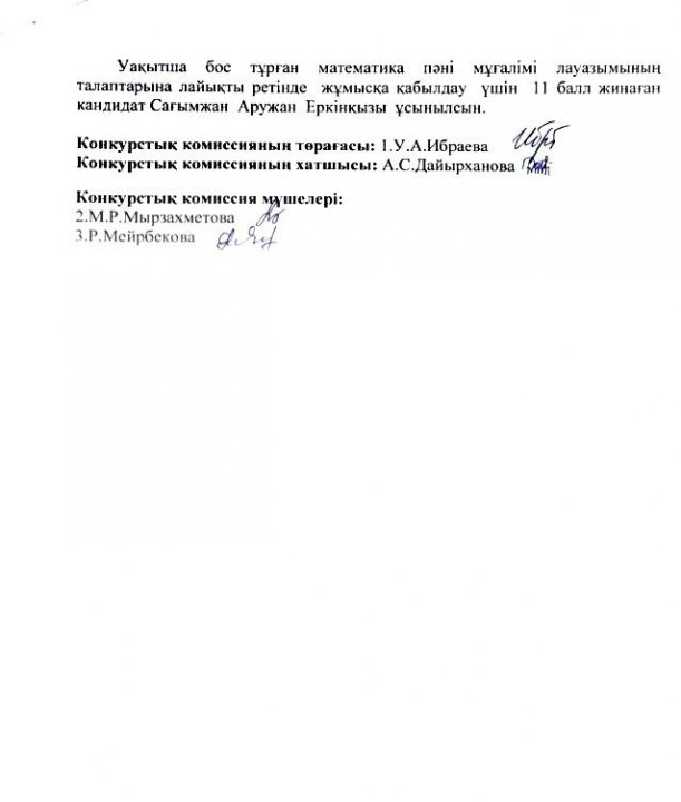 » » "Жамбыл облысы әкімдігінің білім басқармасы Тараз қаласының білім бөлімінің Төле би атындағы №8 гимназиясы" КММ-нің педагогтерді қабылдау конкурстық комиссия отырысының хаттамасы