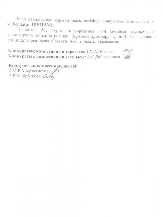 » » "Жамбыл облысы әкімдігінің білім басқармасы Тараз қаласының білім бөлімінің Төле би атындағы №8 гимназиясы" КММ-нің педагогтерді қабылдау конкурстық комиссия отырысының хаттамасы