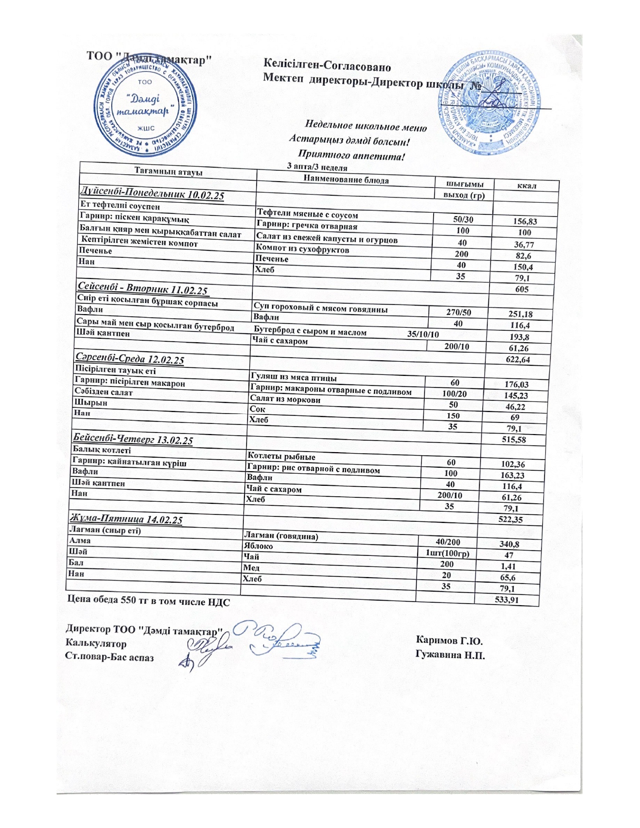 Ас мәзірі. 2025 жыл, ақпан. 3-ші апта. » Төле би атындағы №8 гимназия