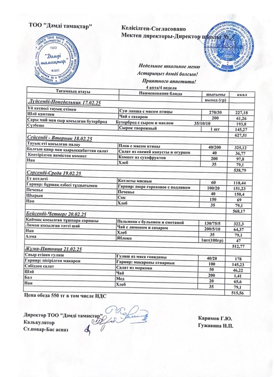 Ас мәзірі. 2025 жыл, ақпан. 4-ші апта. » Төле би атындағы №8 гимназия