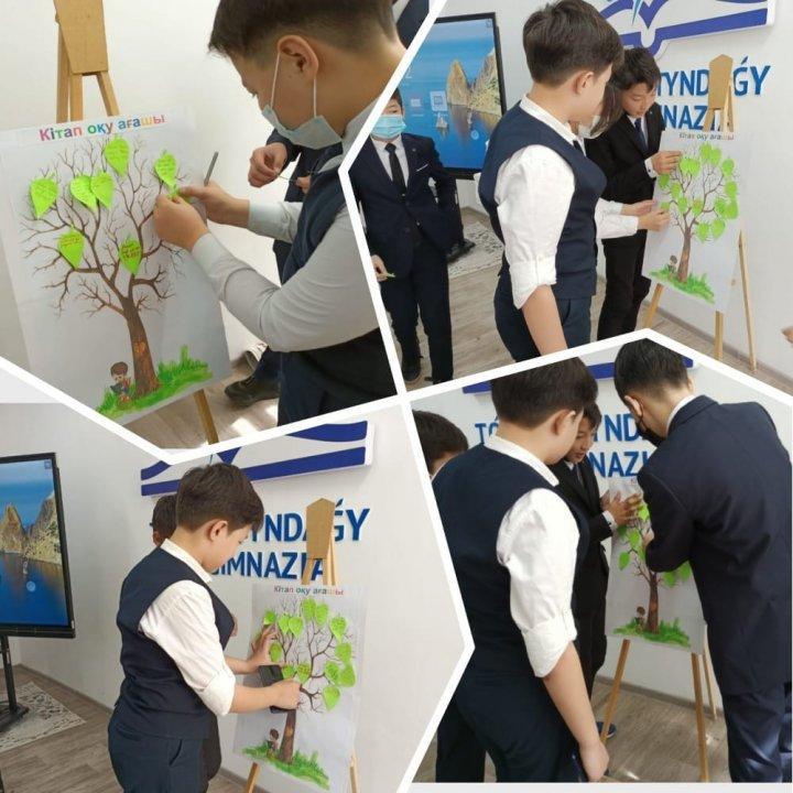 Гимназия кітапханашысы О.Орынбаева, қазақ тілі мен әдебиеті пәнінің мұғалімі Г. Телбаева 7 «А» сынып оқушыларымен бірлесе отырып «Оқуға құштар мектеп» жобасы аясында көрнекті жазушы, Ұлы Отан соғысының ержүрек батыры Қасым Қайсеновтың «Жау тылындағы бала» шығармасын оқып, «Хикаят картасы», «Keyword Hexagon» әдістерін қолдана отырып талқылап, «BOOK BINGO» ойынын өткізді. Оқушылар ойын соңында «Кітап оқу ағашы» арқылы кері байланыс жасады.