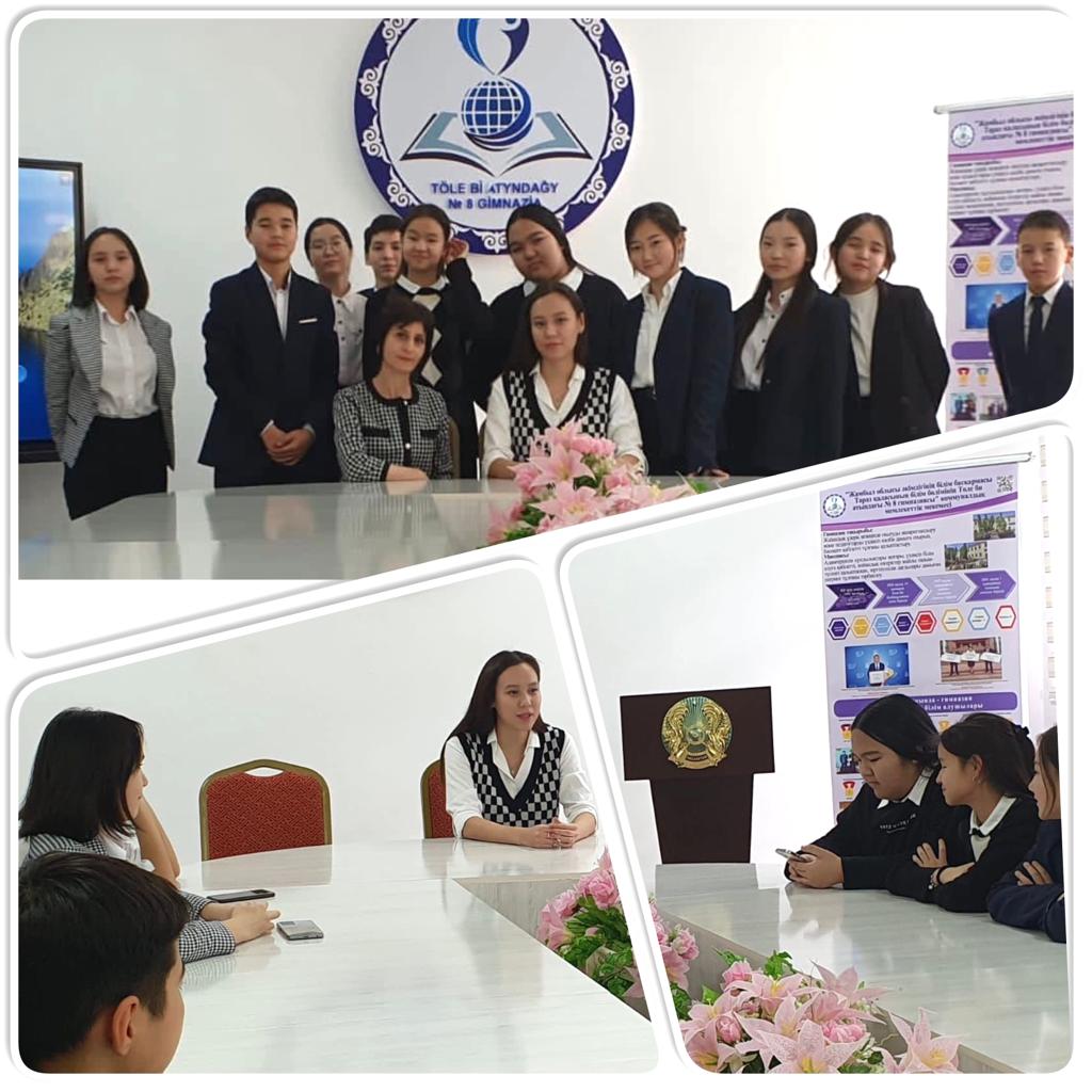 «Түлектердің жұлдызды күні» жобасы аясында 8 «В» сынып білім алушылары мен гимназия түлегі Қиязбекова Диана Маликжапарқызымен кездесу өткізіліп, білім алушыларға білімді меңгеріп қана қоймай, жеке қабілеттерінің ерекшеліктеріне сәйкес білім алудағы және кәсіби саладағы мүмкіндіктерді, мамандықты, және оқу орнын еркін әрі саналы түрде таңдау құқықтарын іске асыру туралы ақпарат берілді.