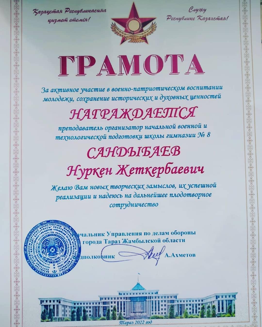 Жамбыл облысы Тараз қаласы қорғаныс істер жөніндегі басқармасы 2005 жылы туылған ұл балаларды қорғаныс басқармасына тіркеуге жоғары деңгейде ұйымдастырғаны үшін және әскери патриоттық тәрбиені жақсы жүргізгені үшін Төле би атындағы №8 гимназиясының АӘжТД пәнінің оқытушы-ұйымдастырушысы Сандыбаев Нуркен Жеткербаевич марапатталды.
