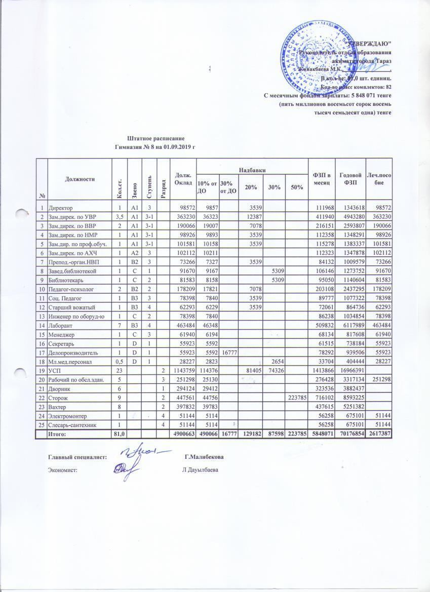 Штатное расписание » Төле би атындағы №8 гимназия