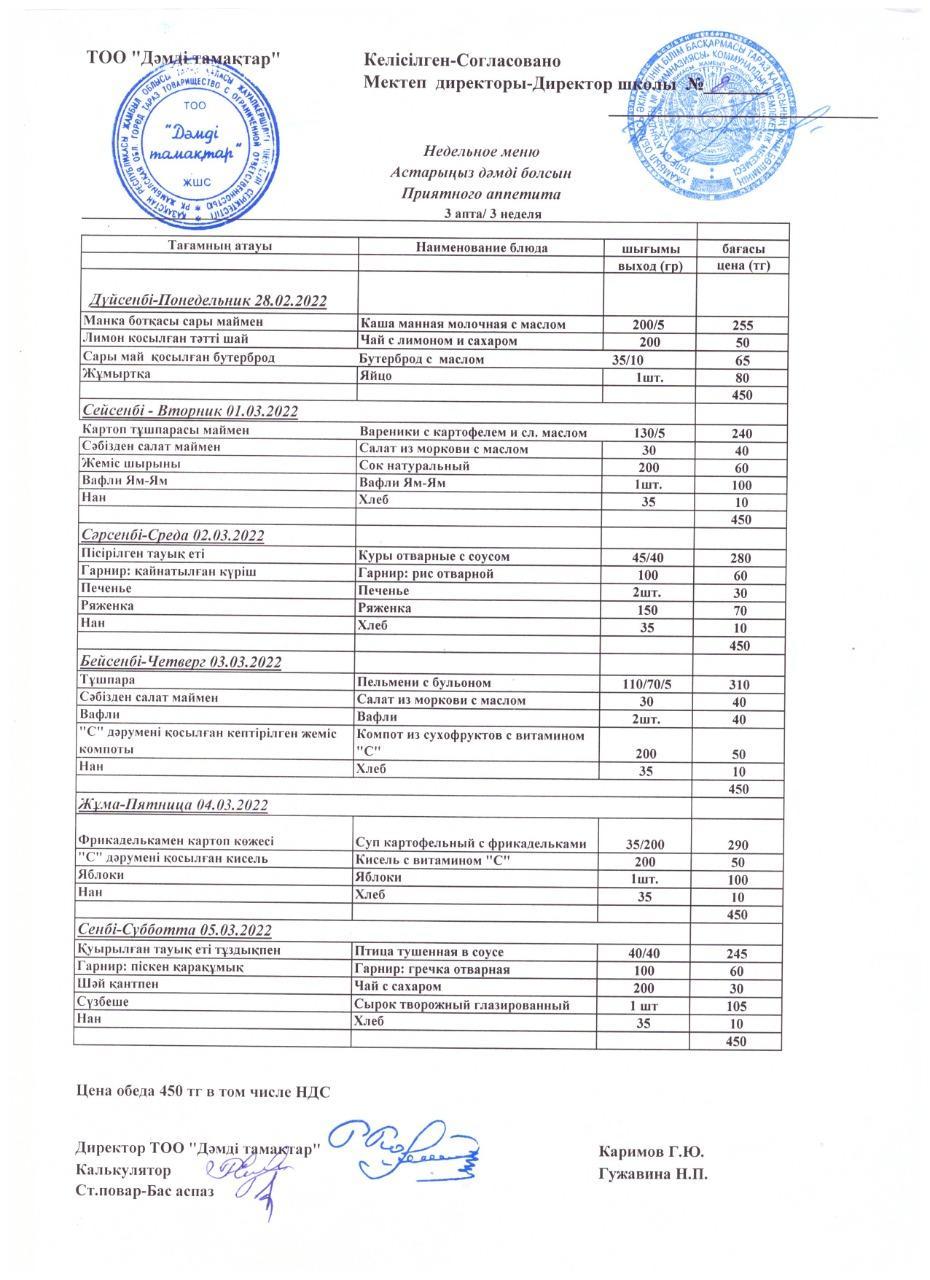 Ас мәзірі 28.02.- 03.03.2022 » Төле би атындағы №8 гимназия