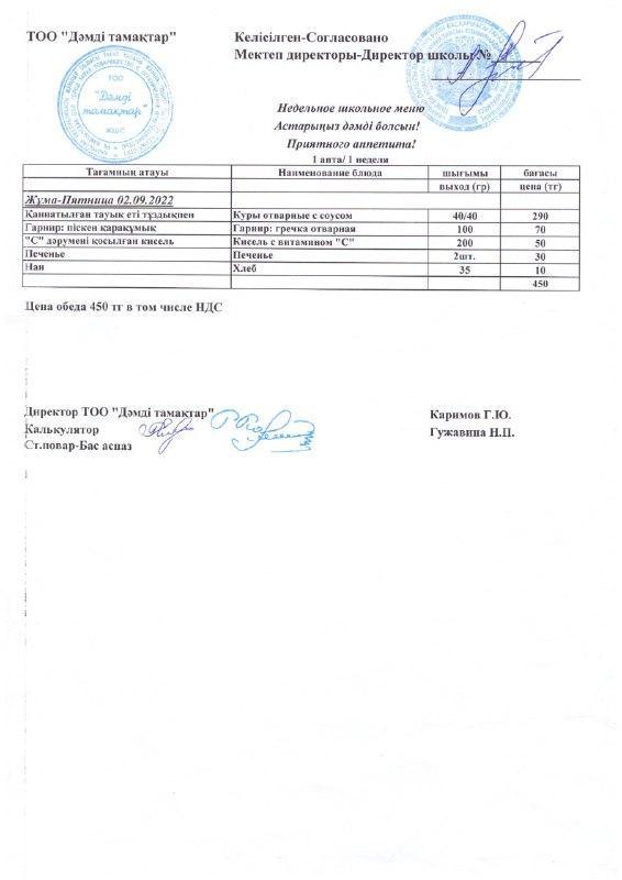 Ас мәзірі 02.09.2022 » Төле би атындағы №8 гимназия
