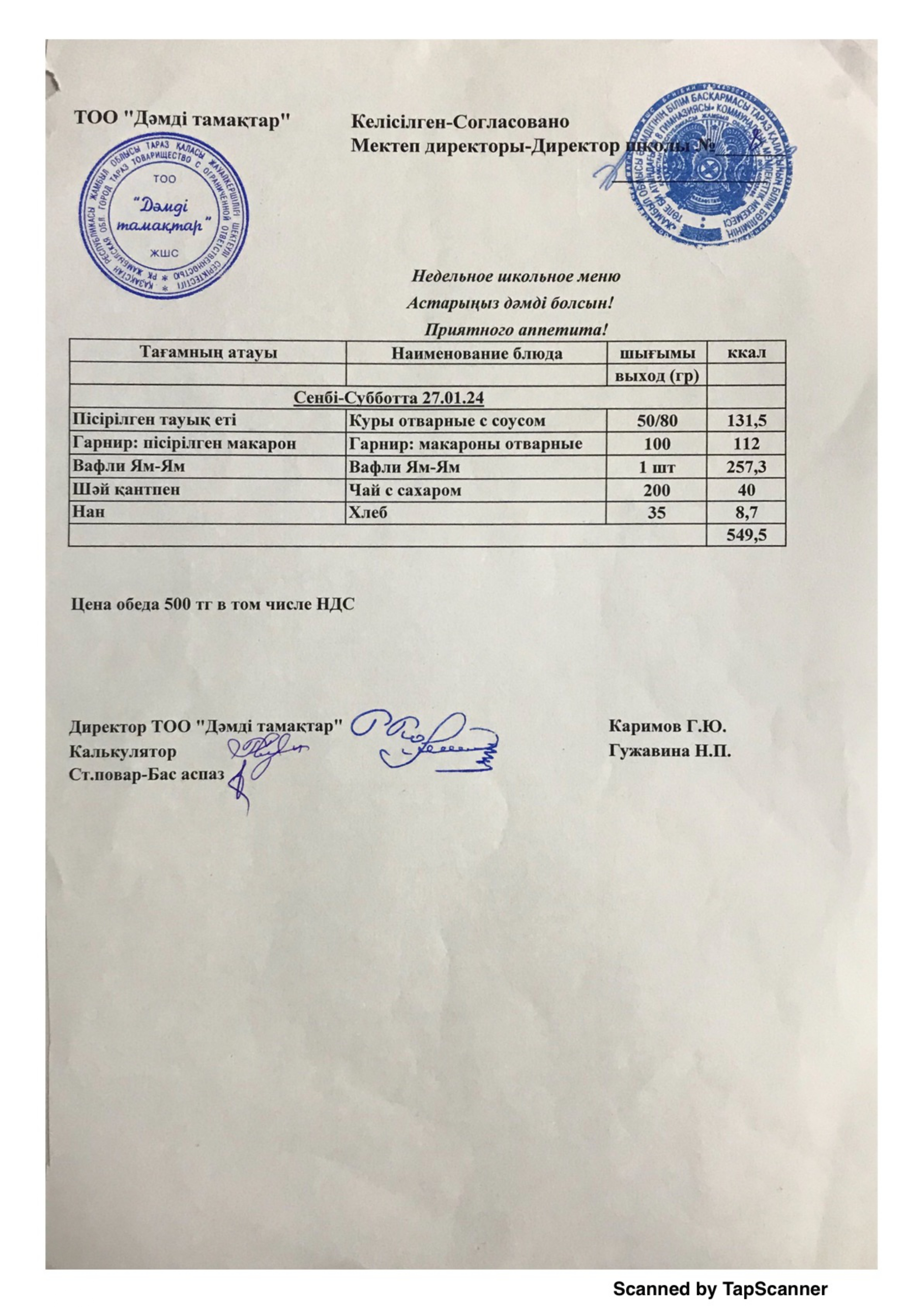Ас мәзірі. 27.01.2024 жыл » Төле би атындағы №8 гимназия