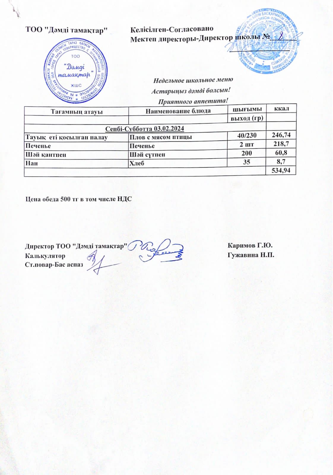 Ас мәзірі. 03.02.2024ж. » Төле би атындағы №8 гимназия