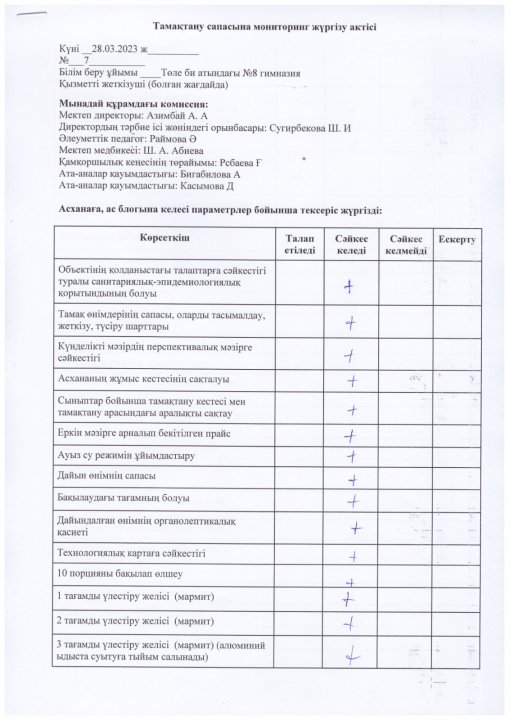 Тамақтану сапасына мониторинг жүгізу актісі » Төле би атындағы №8 гимназия
