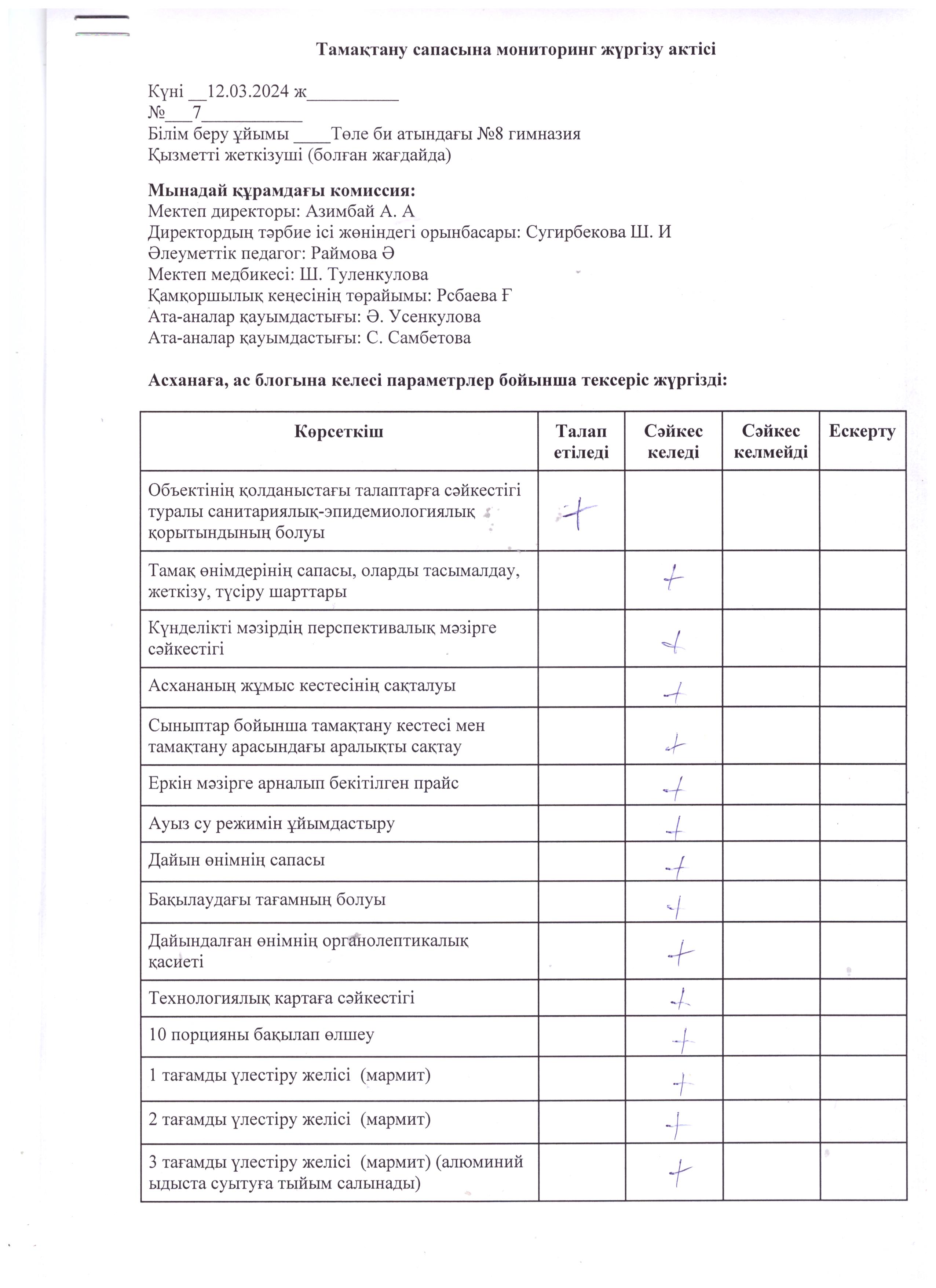 Тамақтану сапасына мониторинг жүргізу актісі » Төле би атындағы №8 гимназия