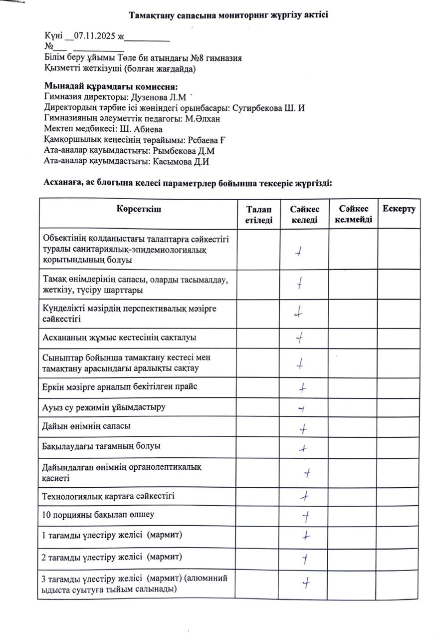 Тамақтану сапасына мониторинг жүргізу актісі » Төле би атындағы №8 гимназия