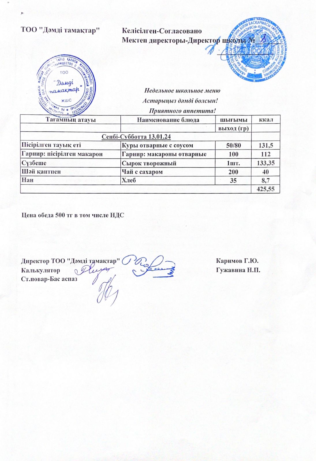 Ас мәзірі. 13.01.2024 жыл » Төле би атындағы №8 гимназия