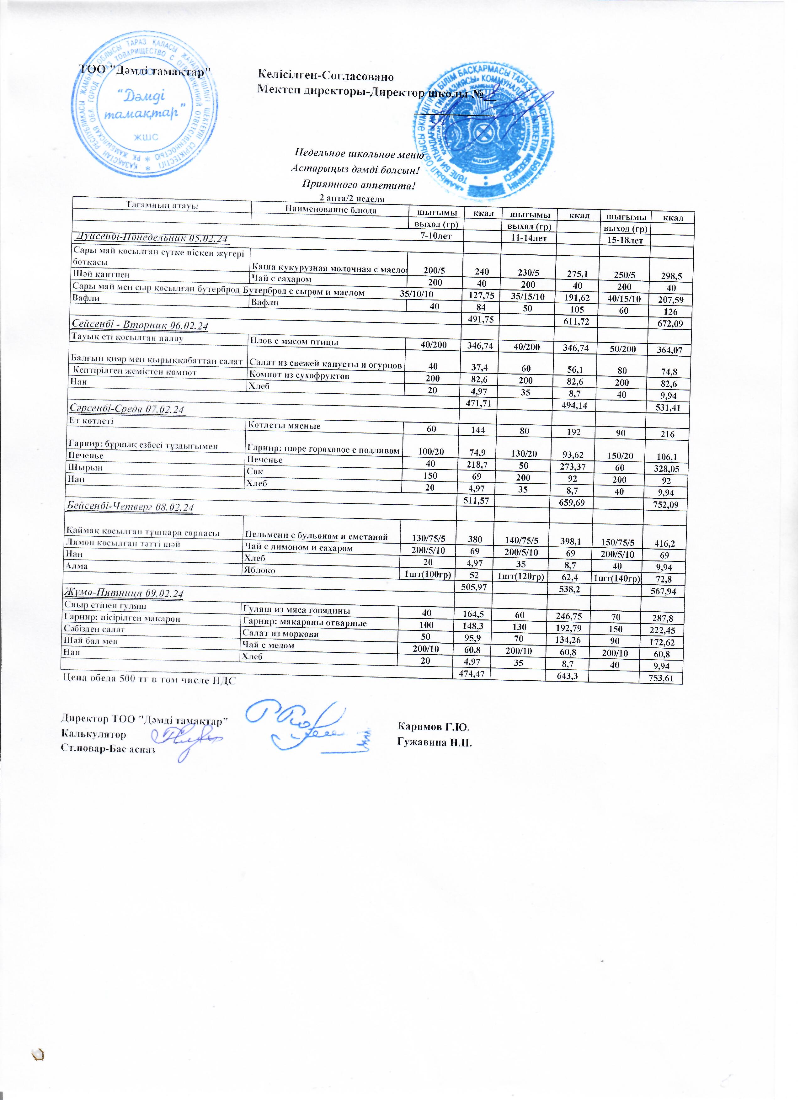 Ас мәзірі. 2024 жыл, ақпан ІІ апта » Төле би атындағы №8 гимназия