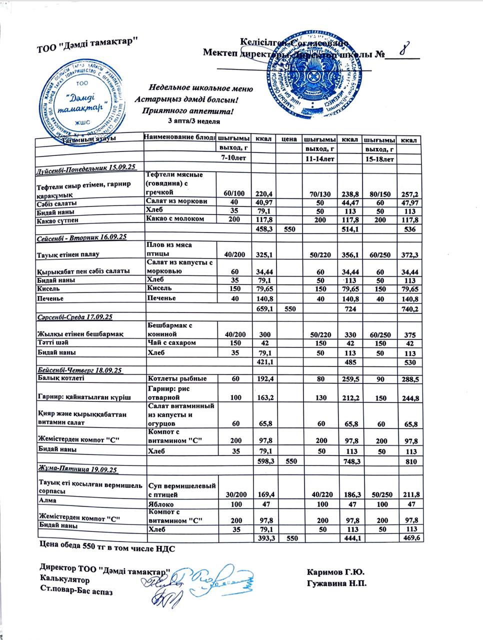 Қыркүйек айы 3-апта ас мәзірі » Төле би атындағы №8 гимназия