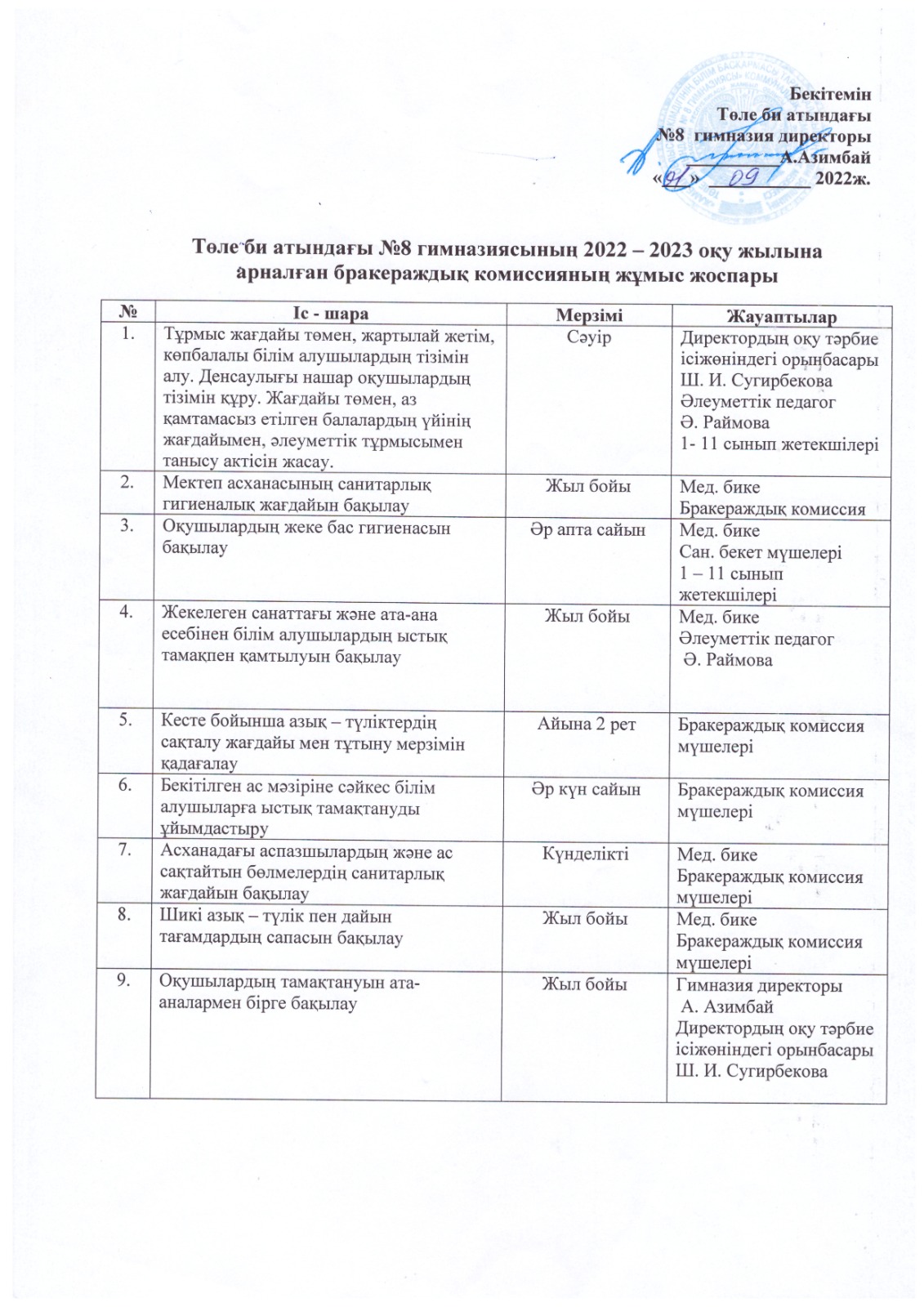 Бракераждық комиссияның жұмыс жоспары » Төле би атындағы №8 гимназия